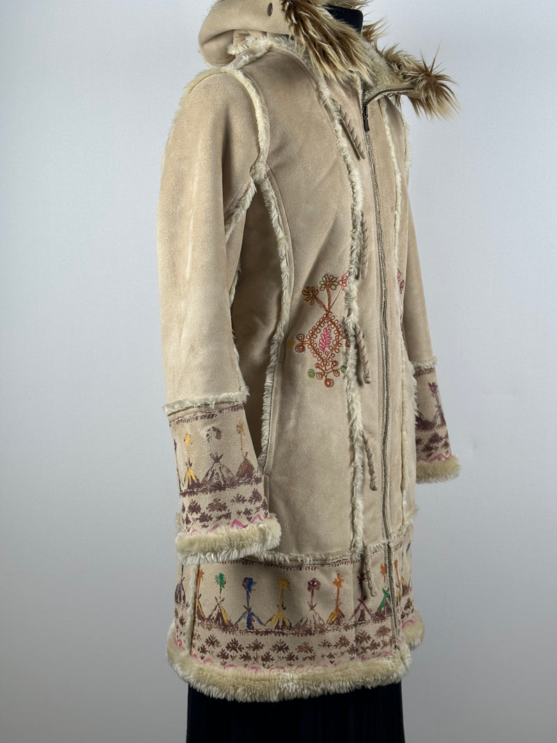 Miss Ewing -merkin pitkä, näyttävä takki yhdistää hennon kirjailun, lämpimän sävyn ja runsaan tekoturkisreunuksen tavalla, joka ei jää huomaamatta.