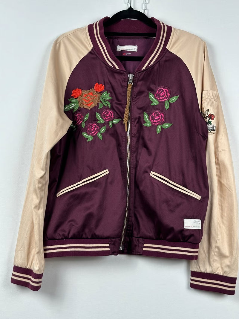 Upeasti viimeistelty Odd Mollyn ikonista tyyliä edustava kirjailtu takki, jossa yhdistyvät urheilullinen baseball-leikkaus ja romanttinen, yksityiskohtainen koristelu. Satiinipintainen kangas, kermaisen vaaleat hihat ja viininpunainen vartalo-osa luovat näyttävän mutta harmonisen kokonaisuuden.